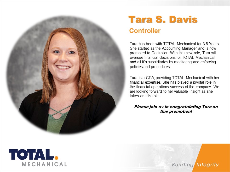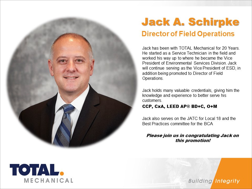 Jack Schirpke has been promoted to Director of Field Operations, Tara Davis has been promoted to Controller and John Lynch has been promoted to Vice President of the company’s Plumbing Division. All three are long time employees of TOTAL Mechanical.